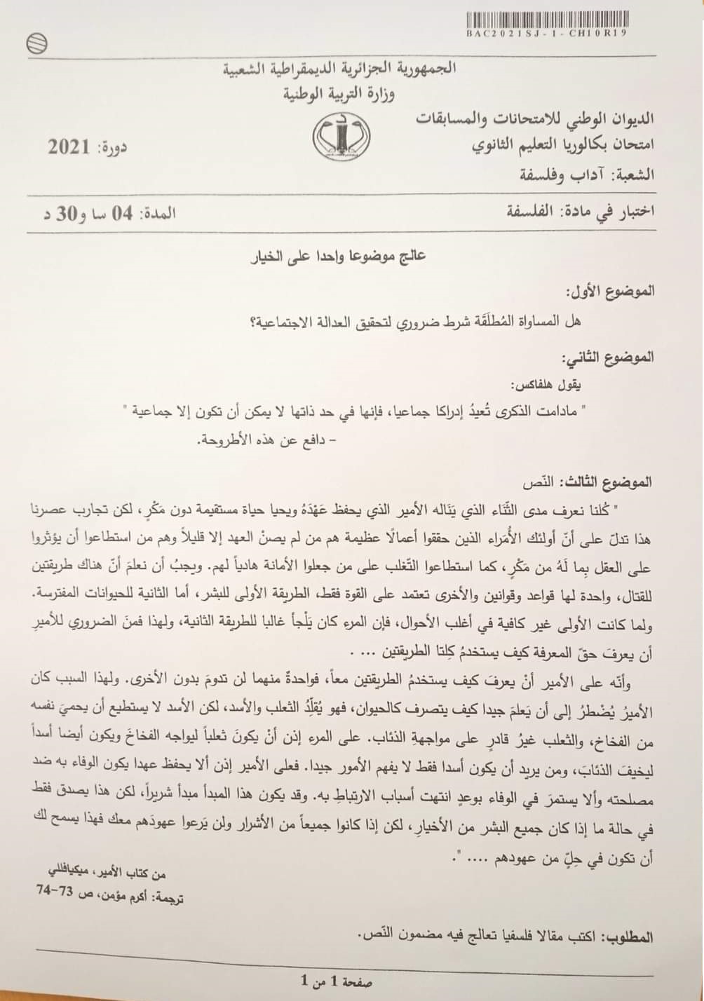 وفيما يلي موضوع البكالوريا مادة الفلسفة :